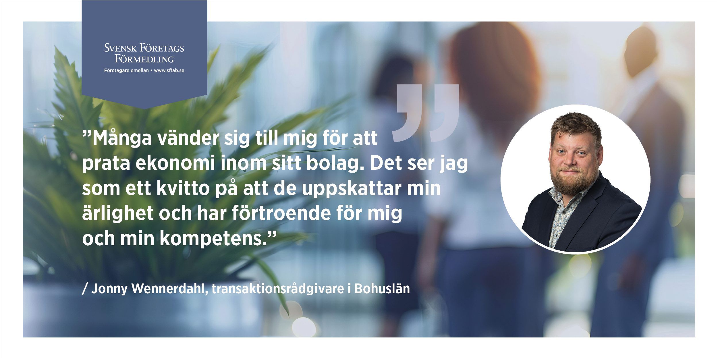 Jonny kommer att ha sin bas i Uddevalla och täcker in norra Bohuslän och Trestad (Trollhättan, Uddevalla och Vänersborg). Inom Svensk FöretagsFörmedling kommer han att dra nytta av alla de med lång erfarenhet och ser att han med sitt lokala nätverk kan bidra på ett bra sätt.